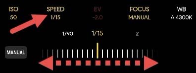 در هر صورت بعد از ضربه زدن روی گزینهی Speed، از طریق اسلایدر پایینی میتوانید سرعت شاتر را به راحتی کم و زیاد کنید. در این زمینه باید آزمون و خطا کنید تا با توجه به محیط بتوانید بهترین سرعت شاتر را برای نوردهی طولانی پیدا کنید.