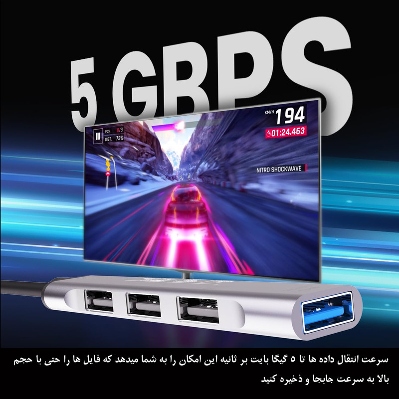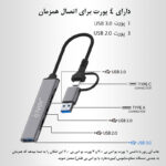 چهار پورت (۱ پورت USB ۳.۰ و ۳ پورت USB ۲.۰) – سرعت بالا در انتقال داده‌ها (USB ۳.۰: تا ۵ گیگابایت در ثانیه، USB ۲.۰: تا ۴۸۰ مگابایت در ثانیه) – قابلیت شارژ دستگاه‌های قابل شارژ – سیستم حفاظت چندگانه – سازگاری با سیستم عامل‌های مختلف (ویندوز، مک، لینوکس) – سازگاری با دستگاه‌های OTG – طراحی باریک و زیبا با جنس آلومینیوم – سبک و قابل حمل